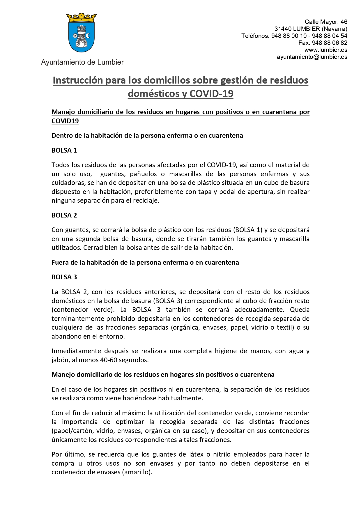 Instrucción para los domicilios sobre gestión de residuos domésticos y COVID